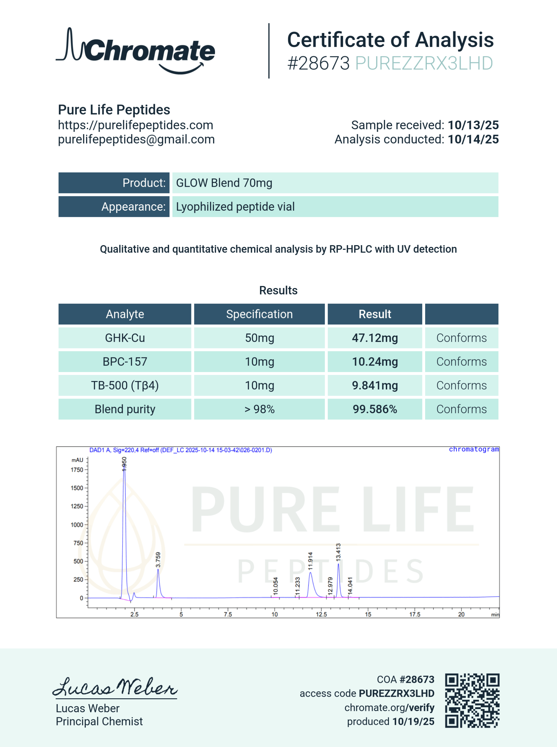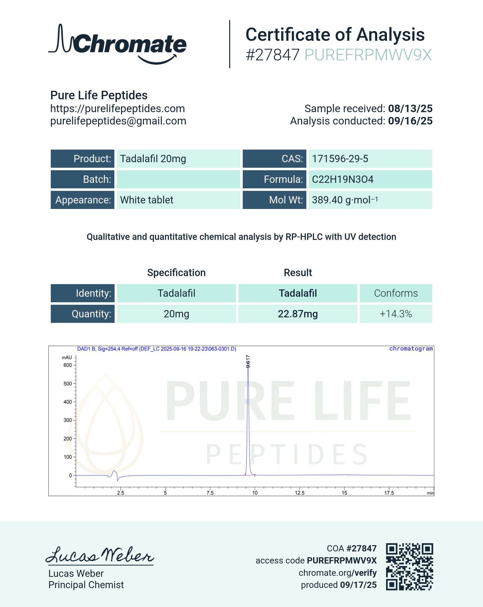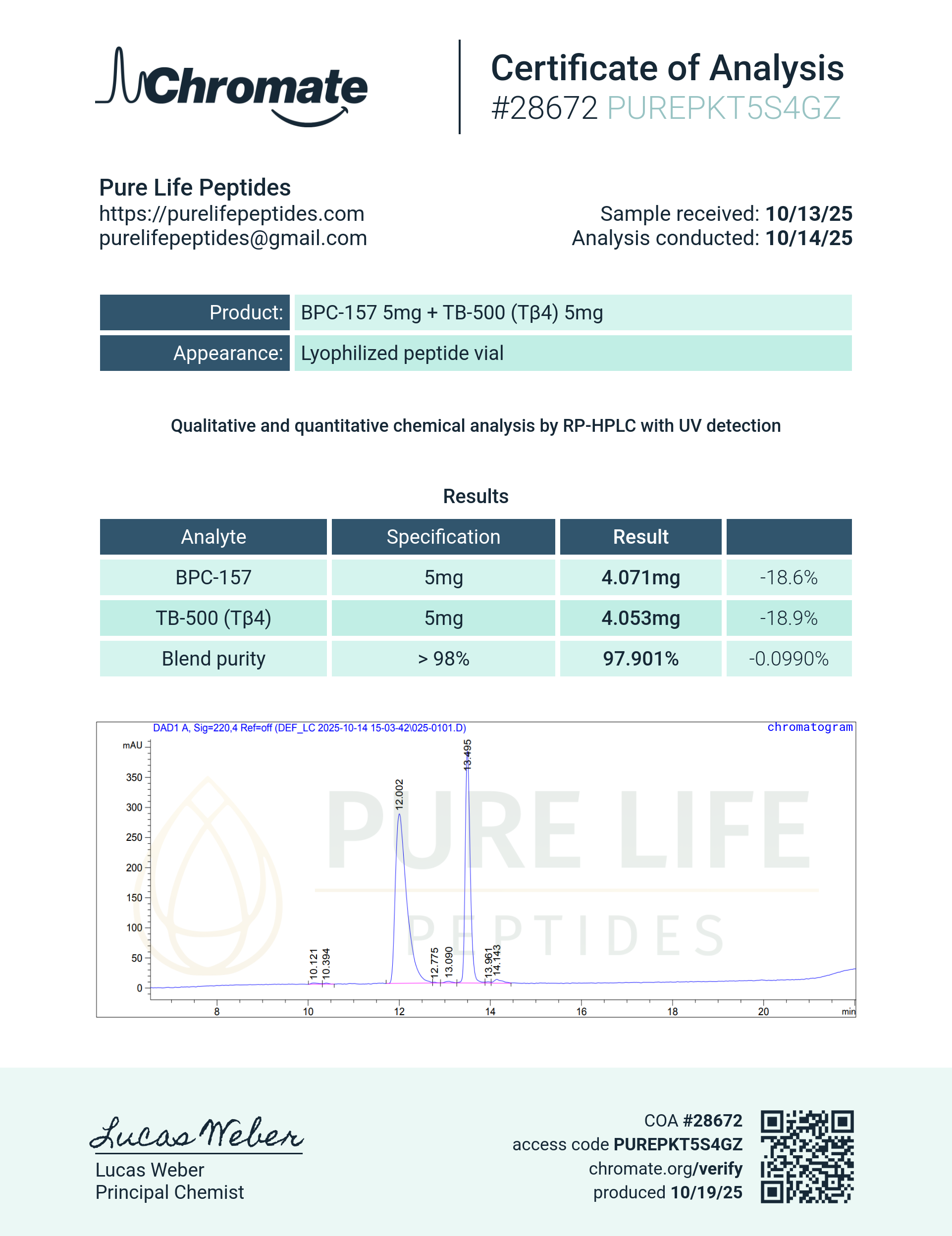 At Pure Life Peptides, quality isn’t claimed it’s proven. Every product we offer is backed by rigorous analytical testing and a Certificate of Analysis (COA), offering researchers full visibility into the integrity of their compounds.